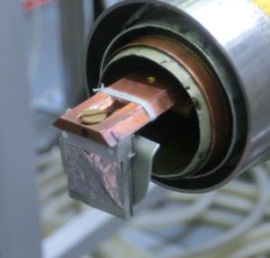 A couple of days ago, the work on one sample ended, and so we switched to a new superconductor. The above photo shows the original sample attached to the cold finger of the cryostat. The sample is the aluminium plate screwed in to the copper cold finger. A piece of cadmium is hanging in front of the sample. Cadmium absorbs neutrons very well, and so is used to mask off areas that might provide unwanted background scattering, and to provide the final slit in the scattering setup, defining the sample. The sample itself (which is a set of thin plates, co-aligned on the aluminium holder) is covered with aluminium foil. Perhaps the main reason for this is to make sure that if the sample works loose, it is caught and doesn’t fall into the cryostat. The samples themselves are stuck down with a very thin glue. We typically use Bostik, well watered down with acetone. The aim is to have as little glue as possible in the beam, as hydrogen atoms scatter neutrons strongly, and so can introduce a lot of background. Other common glues used are GE varnish, STYCAST, and occasionally Cytop, a fluorinated glue. This removes, or reduces, the hydrogen problem, and is fine for small angle neutron scattering, but can be more problematic for more typical diffraction experiments, as there is a strong, broad peak from the glue at higher angles.