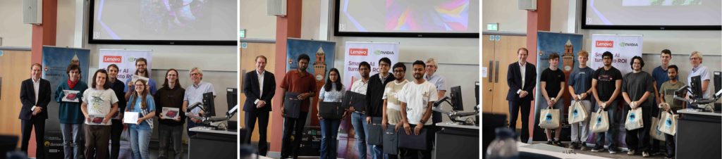 The top 3 placed teams being awarded their prizes by Professor Stephen Jarvis (Provost and Vice-Principal), and Simon Thompson (Director, HPC Solutions, Lenovo). Left: 1st place was awarded to ‘Under the Hood’, middle: 2nd place went to ‘AlgoRythms’, and right: 3rd placed was ‘Beariables’.