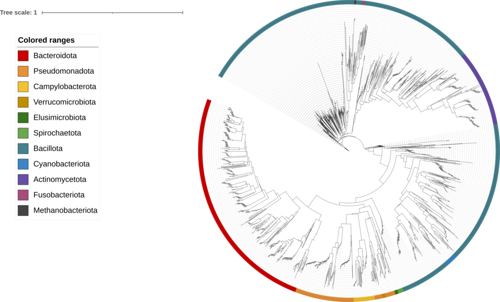 Figure 2 Taxonomic tree of metagenome assembled genomes (MAGs). The tree represents the phylogenetic relationship between the MAGs assembled in the custom analysis pipeline. The MAGs have been grouped by phylum. The tree was generated using mashtree and edited using iTOL.