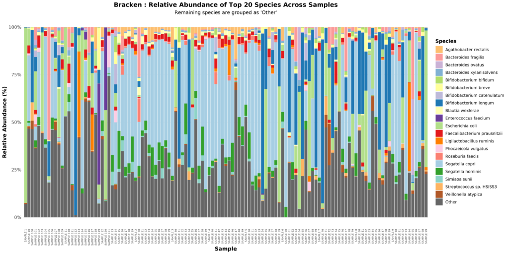 Figure 1 Stacked bar plot of relative abundances of bacterial species. The x axis represents the samples that have been analysed while the y axis represents relative abundances of bacterial species. Each colour corresponds to a different species of bacteria. The taxonomic abundances have been assigned using Kraken2 and Bracken with the standard database and visualized using ggplot2.
