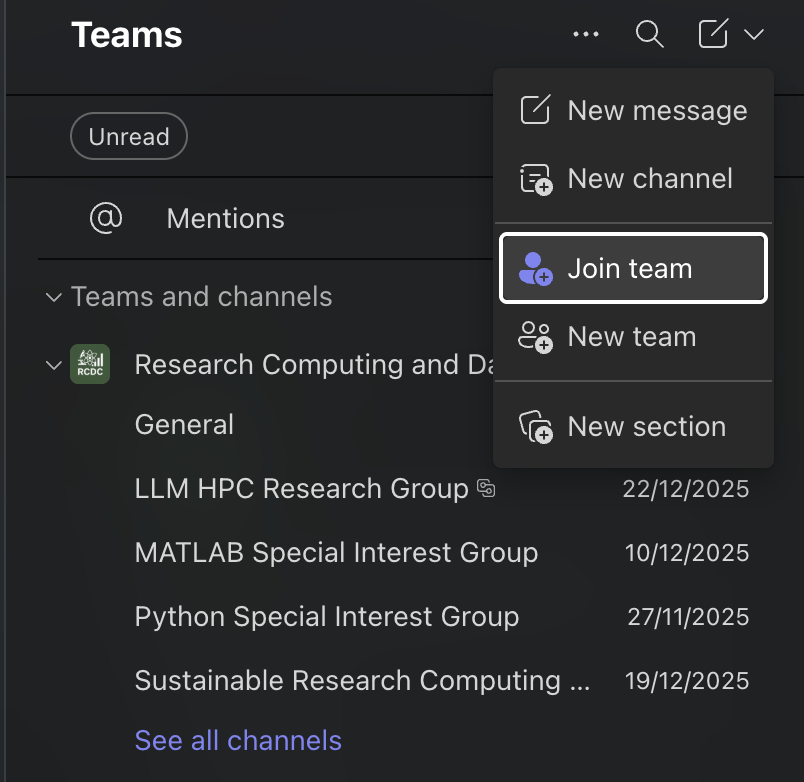 It’s very easy to join RCDC – simply visit the RCDC Teams space and, if you are not already a member, a request to join will be automatically sent to one of the Teams owners, and should be approved quickly. Alternatively, in the University Teams desktop client or app, you can add the join code by selecting ‘Join team’ from the ‘New items’ button and enter the code ‘zo6528n’ (see screenshot).