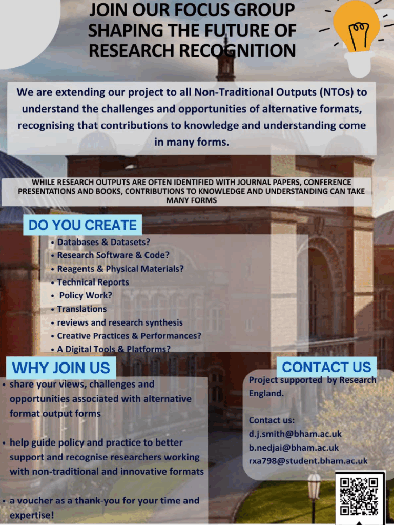 Are you involved in creating research outputs that go beyond traditional journal papers? A University-funded Research England project is currently inviting researchers of all career stages and roles (including technical and supporting) to join upcoming focus groups running from May 12. The aim is to understand the challenges and opportunities associated with alternative (non-journal) forms of research output such as software, reagents, translations, patents, datasets, technical reports, creative practices, policy work & performances. If you are interested in sharing your views, please register here for a focus group.