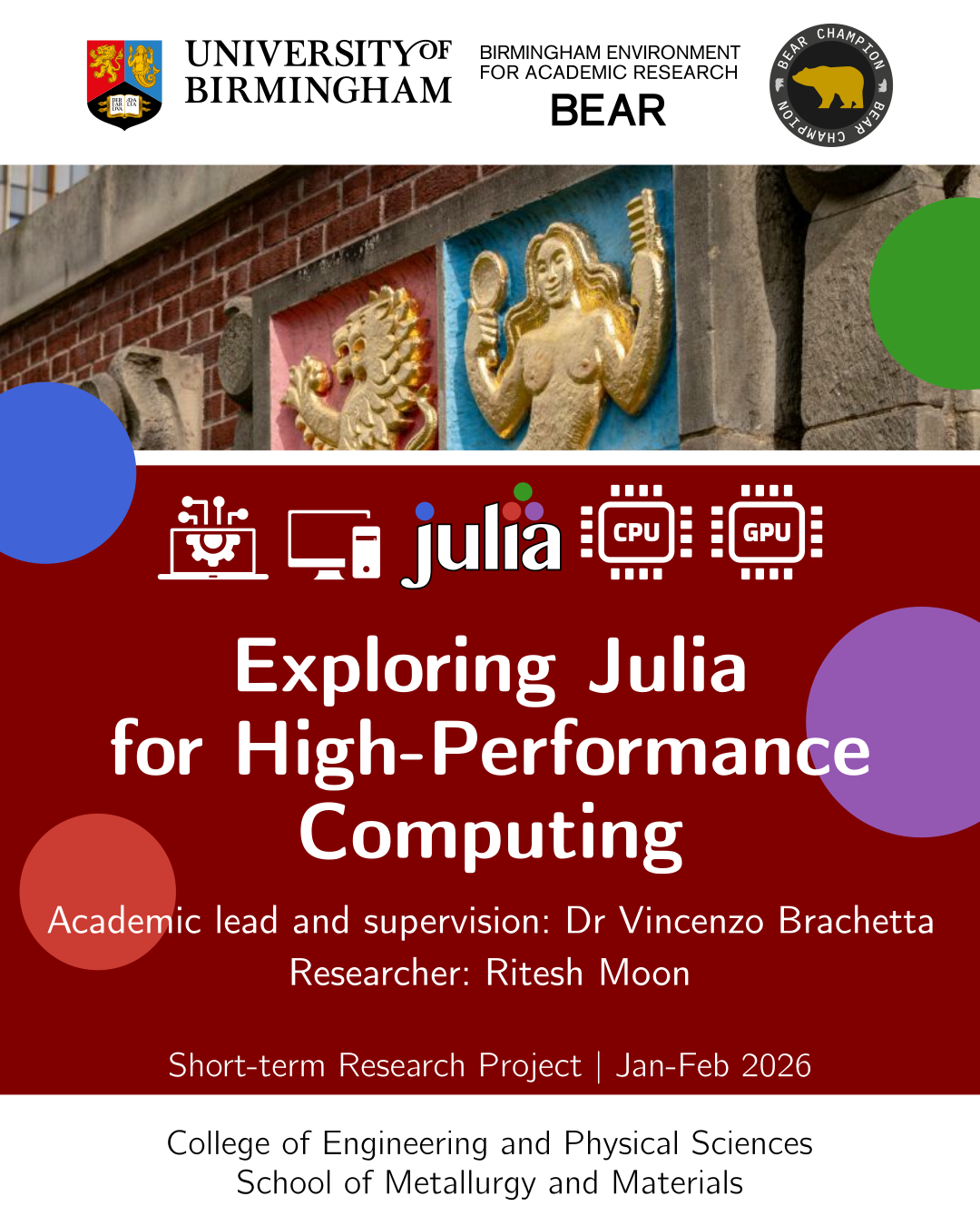 Our latest blog post features a project by Dr Vincenzo Brachetta and Ritesh Moon exploring Julia on BlueBEAR. By benchmarking multi-core, distributed, and GPU-accelerated tasks, the study confirms Julia’s ability to deliver high-level usability alongside top-tier performance within our SLURM environment. This project is essential reading for researchers looking to bridge the gap between rapid prototyping and large-scale HPC execution.