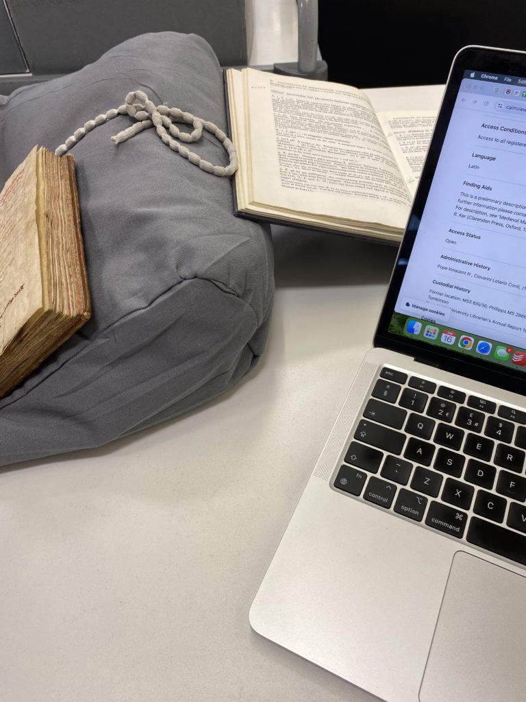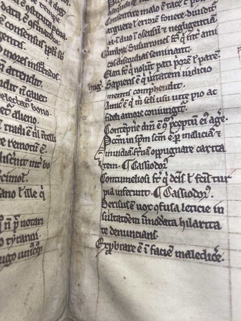 My primary task, during this internship, was to spend time becoming familiar with the collection of medieval manuscripts that the Cadbury Research Library plays host to. From collated sermons to Books of Hours, the sheer range of manuscripts in the archive was wonderful to behold. Each manuscript offers its own distinguishing features, its own signs of use and indications of time passing, with generations of readers each engaging with the same text in different ways. I inputted my findings into a spreadsheet, noting the quiring, evidence of catchwords, or the number of lines on a page. I even had time, following the recommendations of the archivists, to explore some of the early printed material that the Cadbury Research Library holds, which offered a great insight into the continuation of manuscript practice into the printed age.