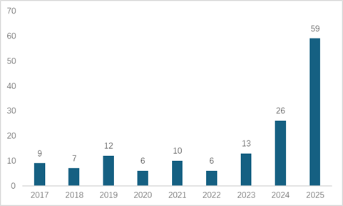 Figure 1 shows the total number of AI firms in the sector by year in the city-region. Overall, we have seen very positive growth in the number of new AI firms created. With only 9 months have passed in 2025, there are 59 AI firms established in the city-region, more than doubling the amount of new AI firms in 2024. This has shown very optimistic trajectory in the city-region to catch up.
