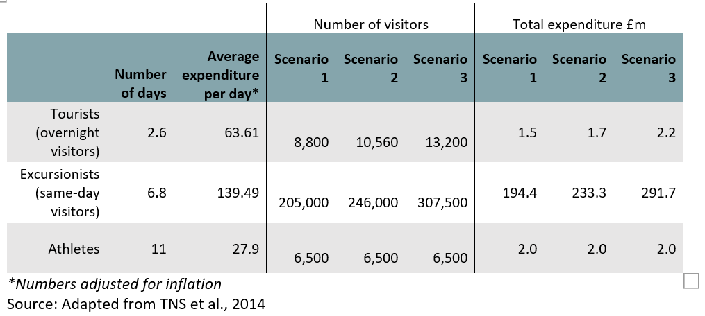 The visitor numbers in scenario 1 are taken directly from Allan et al.’s, 2017 impact study of the Glasgow 2014 Commonwealth Games. The 205,000 excursionists figure reports the non-Scottish excursionists to the games in an attempt to capture unique visits for the games and because local visits are essentially displacing other local consumer spending and unlikely to have a significant net effect see (Allan et al, 2007). By isolating spending by non-locals, we are identifying spending that will be additional to the area and so likely to be the net impact on the games.