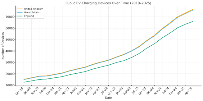Figure 1 Public EV chargers from 2019 to 2025 in UK, Great Britain and England