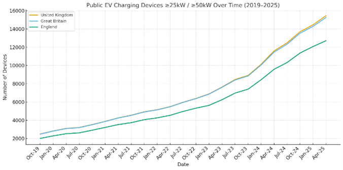 Figure 2 Public EV chargers 25 kW or more from 2019 to 2025 in UK, Great Britain and England.