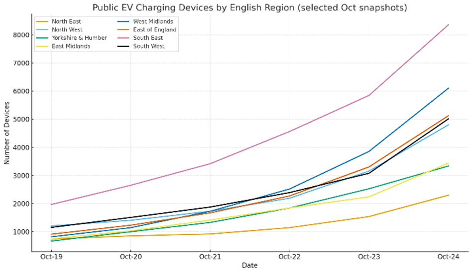 Figure 3 Public EV Charging Devices by English Region (Oct 2019 to Oct 2024)