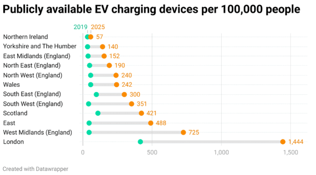 Figure 4 Publicly available EV charging devices per 100,000 people (2019 vs 2025) by UK region.