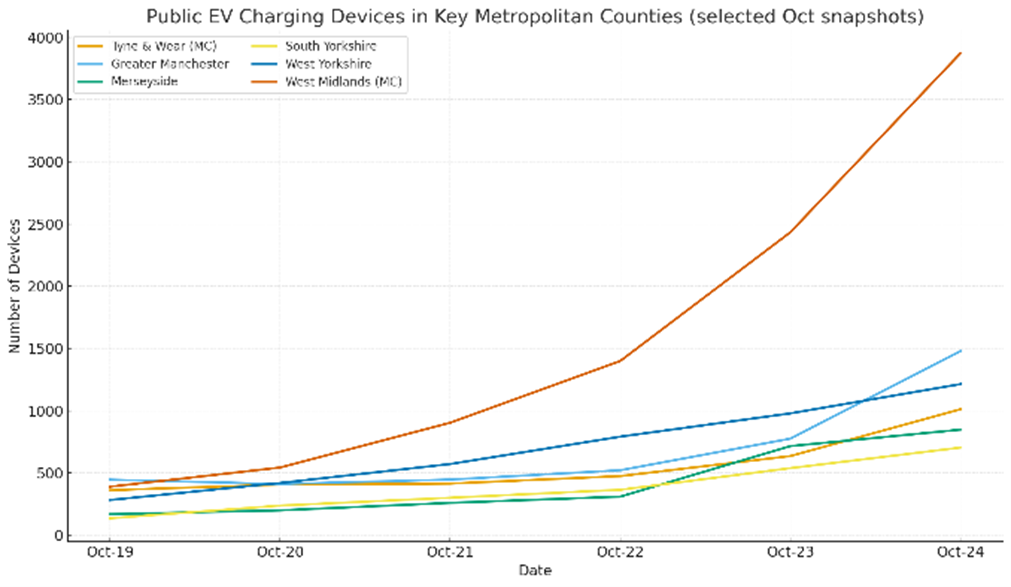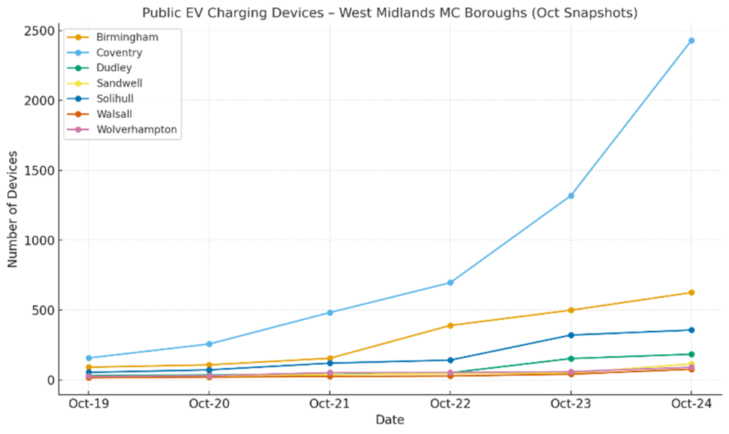Analysis of the individual boroughs within West Midlands MC from Oct 2019–Oct 2024 (Fig. 7) shows infrastructure lag in some boroughs: Walsall (from 14 to only 71 chargers) and parts of Sandwell remain far behind the metropolitan average; without targeted support they risk being EV “cold spots.”
