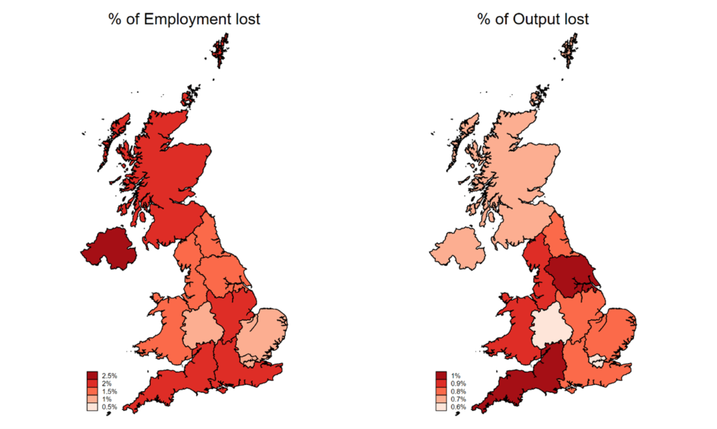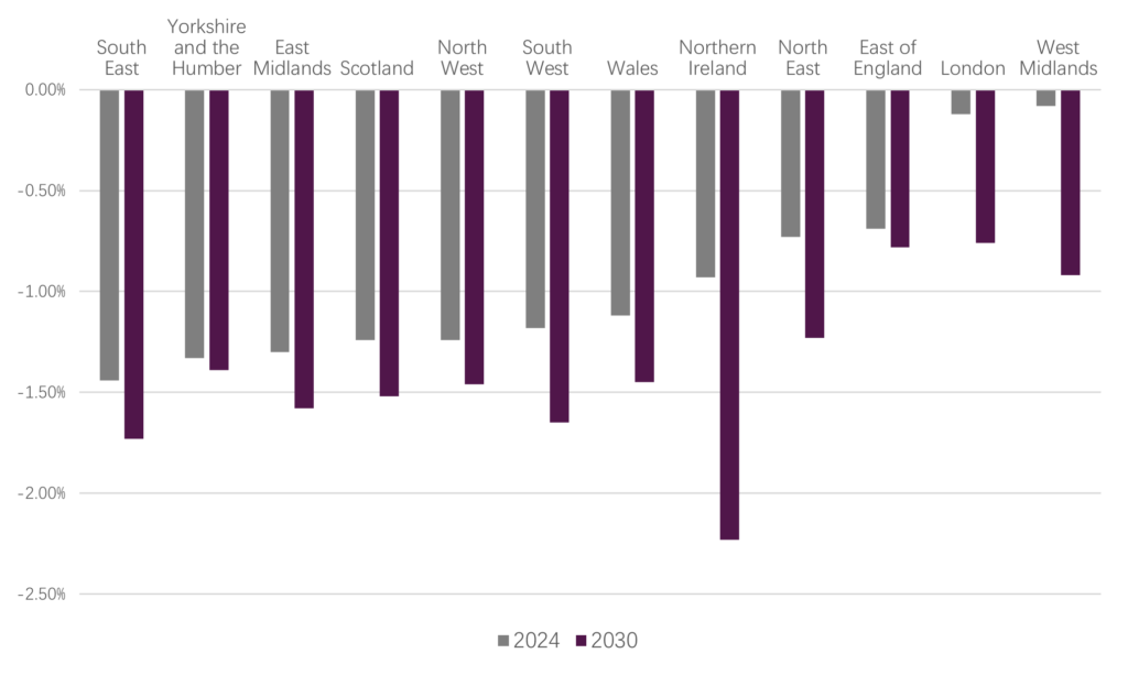 By 2030, the picture is forecast to look different with all regions average seeing more employment impacted with the average employment impact in 2024 of -0.95% falling to -1.39% in 2030.