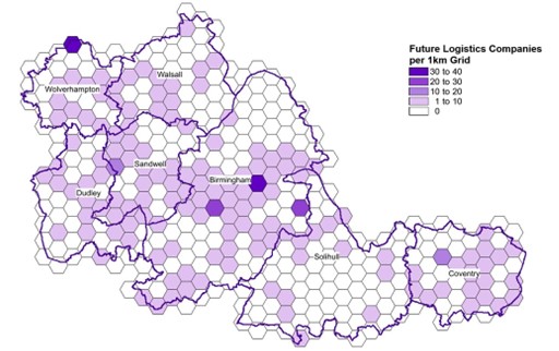 A series of static hex-based heat maps have been developed – one per opportunity area – showing the density of firms within 1km grid cells across the WMCA region. These tools help identify spatial clusters, reveal infrastructure gaps, and inform more targeted, geography-sensitive interventions. An example is shown in Figure 2 below, which visualises the spatial distribution of firms within the Future Logistics opportunity area. The map reveals a clear concentration of logistics-related businesses around Birmingham, Coventry, and key parts of the Black Country, including Sandwell, Wolverhampton, and Walsall. Notably, several high-density cells are found in the Birmingham and Solihull corridor, close to major logistics hubs such as the M42 and Birmingham Airport, as well as in Coventry—reflecting the region’s strategic connectivity and proximity to national freight routes.