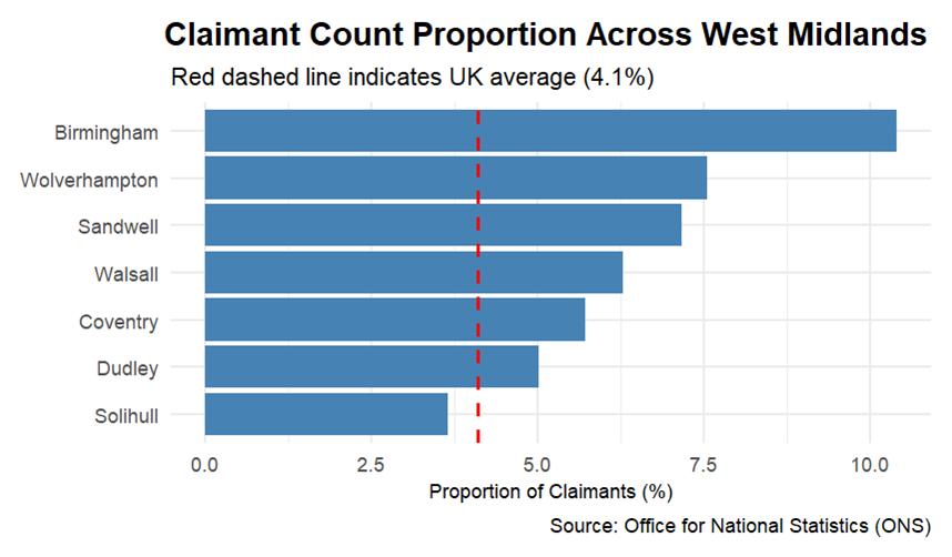 Yet, the consequences of the pandemic are not confined to health alone. The pandemic dramatically reshaped the labour market as hundreds of thousands of workers withdrew from the labour force due to the scale of increase in work limiting-health problems, poor population health, and an increase of retirees. Across the Midlands, the gaps in both unemployment and health have widened, revealing not only a rise in regional inequality, but also a stark contrast within West Midlands communities. Particularly, Job Seeker’s allowance and Out of Work Universal Credit claims across the West Midlands communities range significantly and point to growing interregional labour disparities. For example, Birmingham exceeds the national average by more than twofold, while some areas, like Solihull, fall below the average UK claimant rate (see Figure 1).