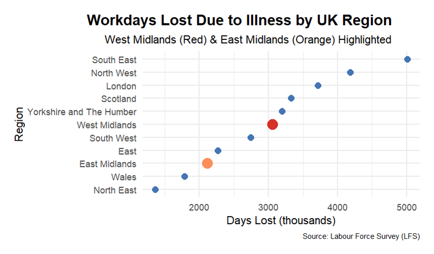 The interregional range of workdays lost due to illness between the West and East Midlands reveals a divergence in health disparities. The East Midlands region reports some of the fewest workdays lost due to illness, while the West Midlands reports a figure closer to the national average. Higher rates of chronic illness, greater socioeconomic deprivation, and industries with more physically demanding labour and lower wage service jobs concentrated in the West Midlands are likely to contribute to the disparity compared to the East Midlands.