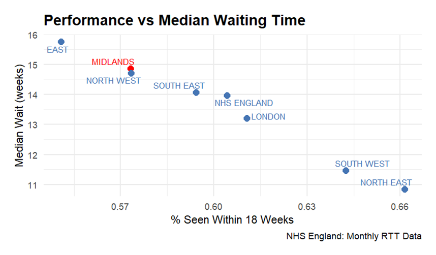 The NHS has set forth its national guidelines that the maximum wait time for non-urgent, consultant-led treatment is 18 weeks, thus setting the standard for all regional hospitals to follow. However, demand for healthcare has outpaced the ability of the NHS to provide timely services. The Midlands have some of the longest patient waiting times, and the percentage of patients seen by a practitioner within the NHS benchmark of 18 weeks is one of the lowest in the country, with only 57% of patients being seen by a practitioner in the allotted time frame. NHS show NHS Midland hospitals perform at similarly low levels, with no significant variation between the West or East Midland hospitals. With the West Midlands reporting a higher rate of self-reported sickness and chronic illness, NHS performance lies at the heart of addressing the issue of a sicker labour force and the consequent economic burden faced by the region.