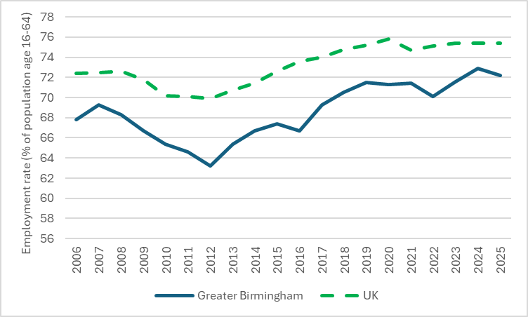 Figure 4. Employment rate, 2006 – 2025, Greater Birmingham and UK