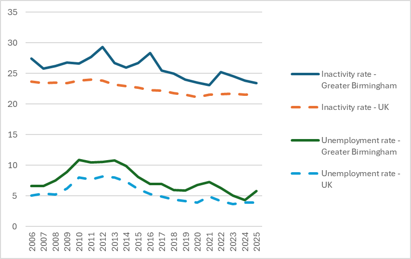 Figure 5. Economic inactivity and unemployment rates*, 2006 – 2025, Greater Birmingham and UK