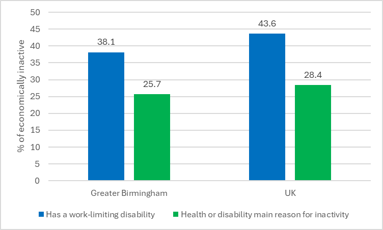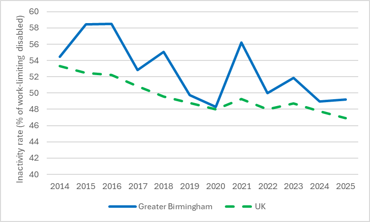 Figure 8. Economic inactivity among those reporting a work-limiting disability, 2014 – 2025, Greater Birmingham and UK