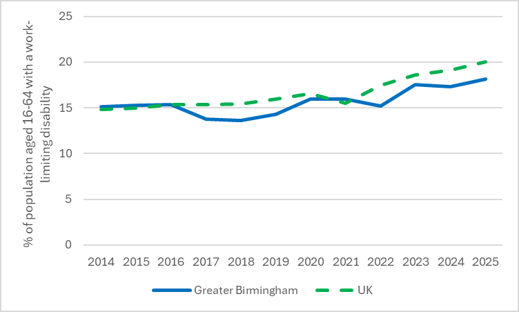 Figure 7. Prevalence of work-limiting disability in the population aged 16-64, 2014 – 2025, Greater Birmingham and UK