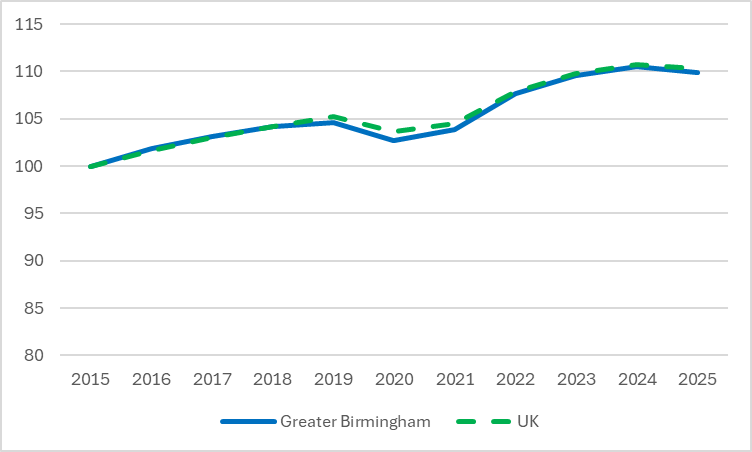 Figure 2. Jobs growth, 2015-2025, Greater Birmingham and UK (2015 = 100)