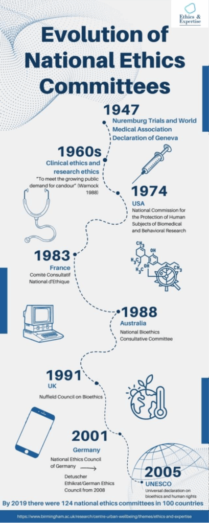 National ethics committees first emerged in Europe following calls from medically focussed institutions. There was a recognised need for new ethics codes associated with the Nuremburg Trials and World Medical Association Declaration of Geneva in 1947. These were in response to the abuses carried out by doctors under the Nazi regime.