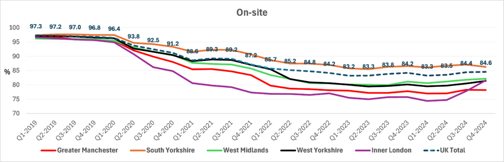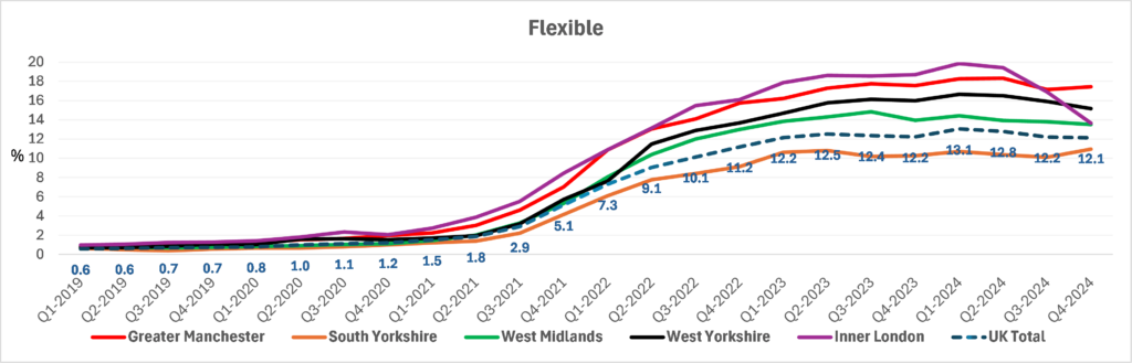 Looking at the spatial dimensions of these patterns, using the example of selected city-regions, it appears that some areas moved faster to non-traditional models of working than others (Figure 2). During the analysis period (2019-2024), Inner London saw the highest increase in remote-only roles, which rose from just over 3% in Q4 2019 to nearly 17% in early 2021. By 2024, this proportion had dropped to around 5% but remained well above the UK average (3.3%). Greater Manchester and the West Midlands followed a similar trend, although they demonstrated smaller peaks. On the other hand, South Yorkshire experienced slower changes. Its remote-only share peaked at 7.2% in Q1 2021 and declined to less than 3% at the end of 2024.