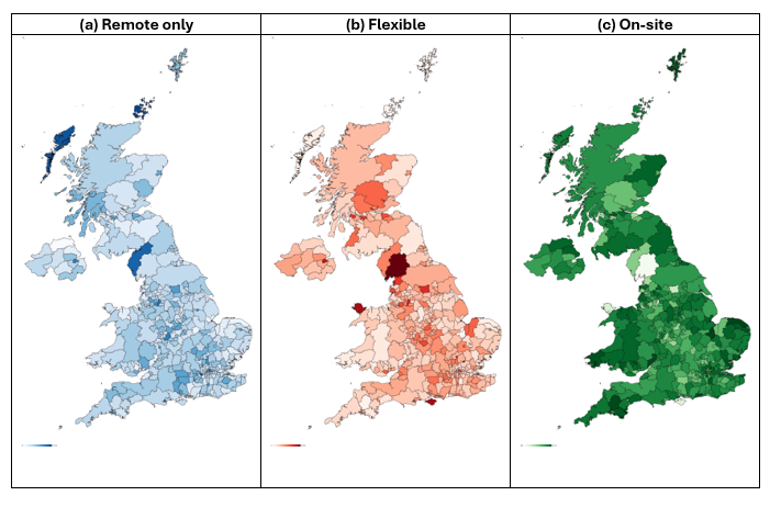 Note: Darker shading indicates higher shares. High-resolution maps showing the share (%) of each workplace model in total job demand by Local Authority District area are available at the following links: remote only, flexible (hybrid), on-site. Source: Adzuna Intelligence; authors’ own calculations.