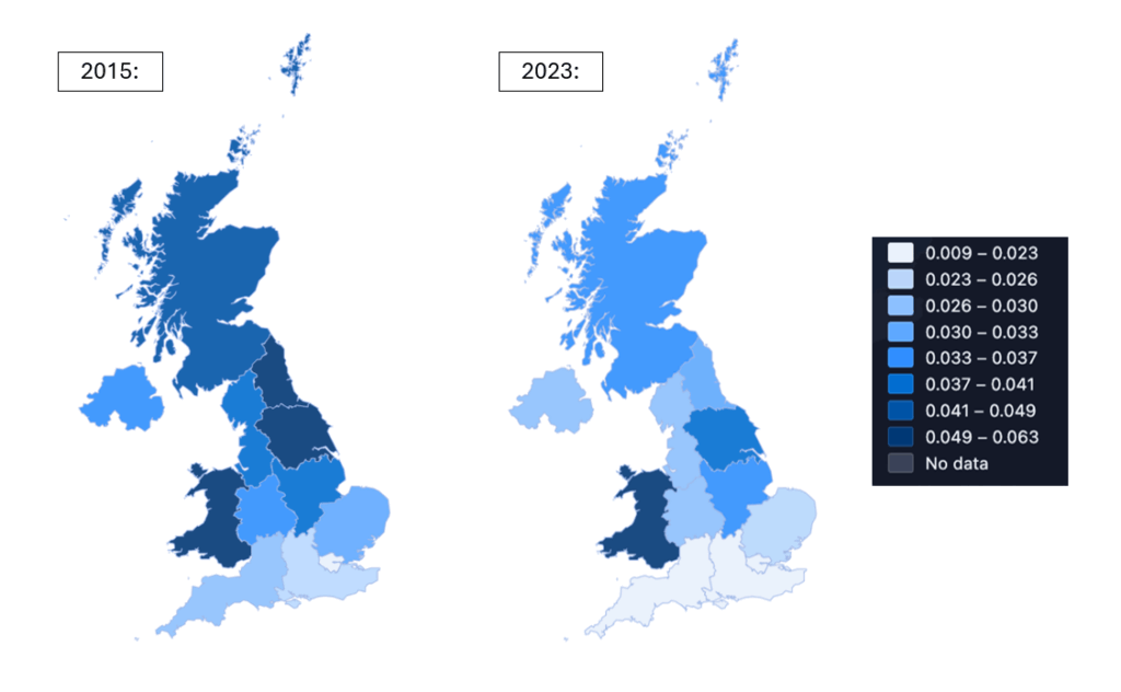 Figure 2 shows how the amount of energy required to produce £1m in GVA has changed between 2015 and 2023 by region. The darker blue areas indicate relatively higher energy intensities, and lighter blue areas lower energy intensities. The maps reveal decoupling of energy use from GVA generation, although this trend varies significantly across regions.