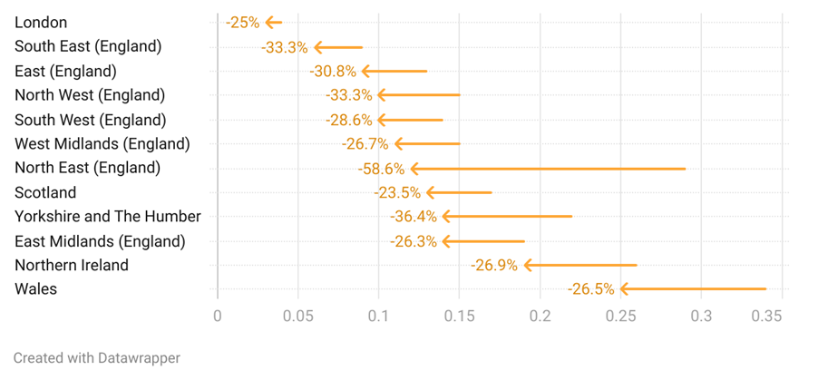 Figure 3 shows the change in emissions between 2015 and 2023 by region. Once again, a similar pattern is observed with all regions reducing their emissions intensity over this time period, reflecting the UK’s national commitments to decarbonisation and net zero.