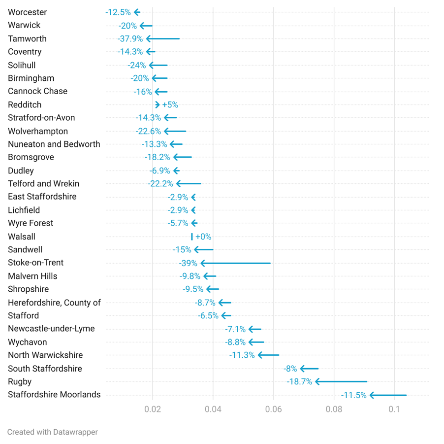 Figure 4. Change in Energy Input (KTOE) per £1m GVA by LA in the West Midlands (2015-2023)