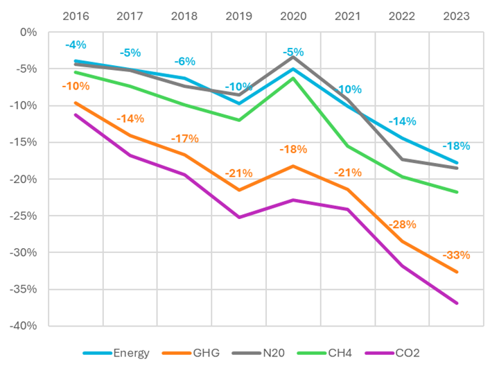 The amount of energy and emissions required to generate Gross Value Added (GVA) has fallen significantly. Some key figures upfront on what has changed between 2015 and 2023: