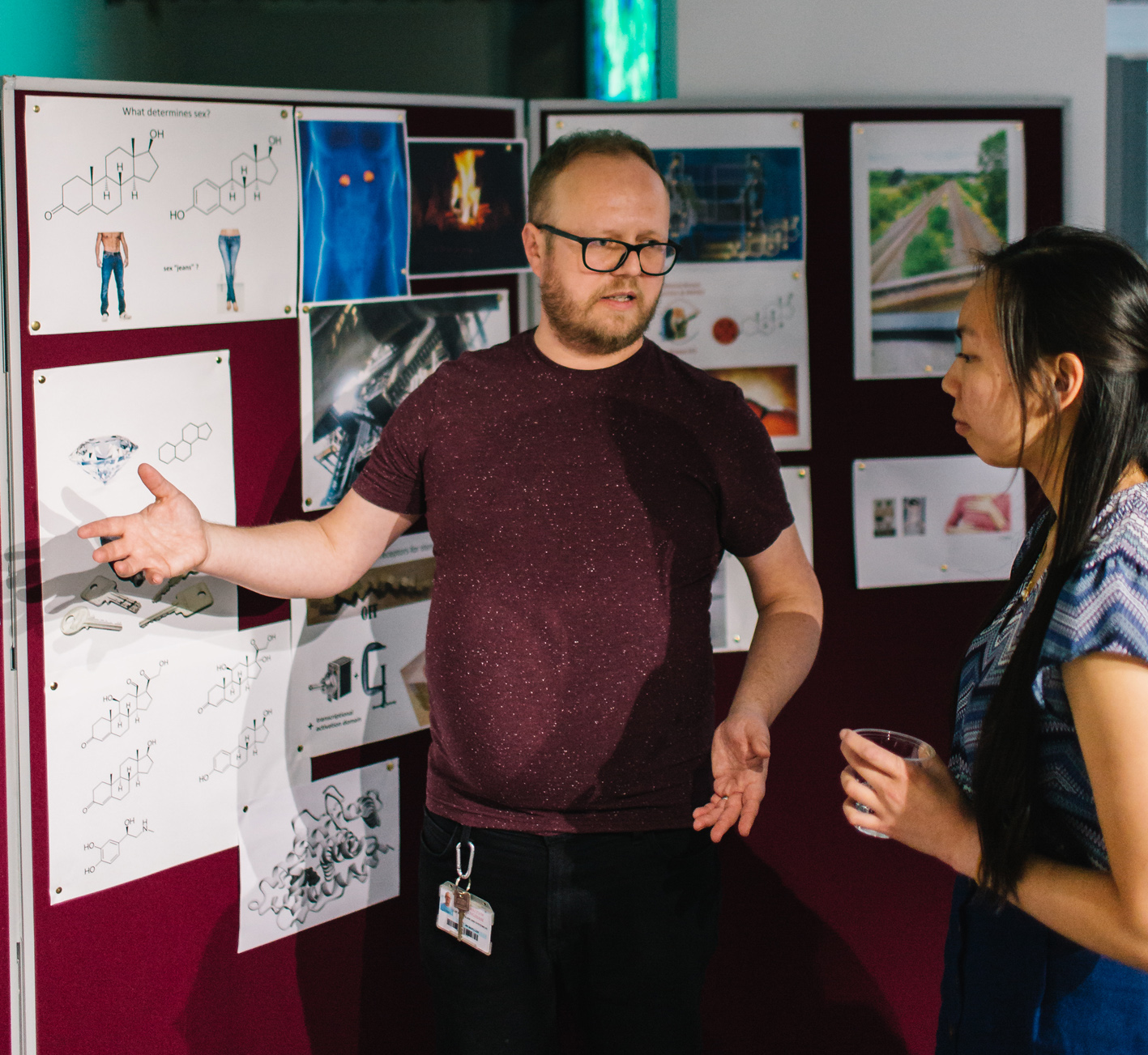 A photograph of IMSR researcher Jonathan Mueller talking to members of the public about his research on sulfation pathways and steroids at an engagement event