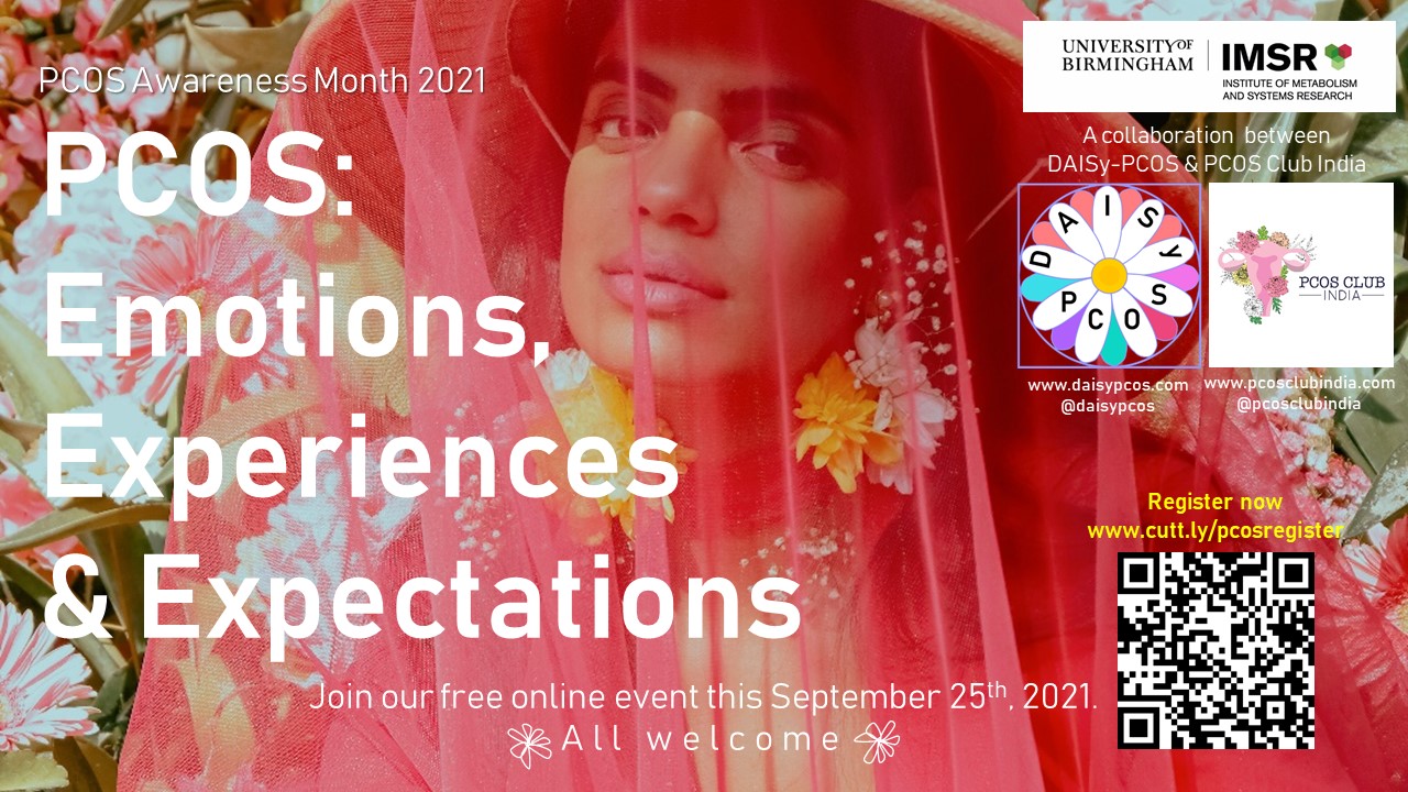 The image promotes an event for PCOS Awareness Month on September 25th, 2021. The event is called PCOS: Emotions, Experiences and Expectations. People are invited to join this free online event taking place on this date by registering on Eventbrite at www.cut.ly/pcosmonth The event is organized by the DAISy-PCOS team based at the Institute of Metabolism and Systems Research at University of Birmingham. You can find out more at www.daisypcos.com. The event is in partnership with PCOS Club India. There is also a photograph of a women surrounded by daisy flowers accompanying the text.